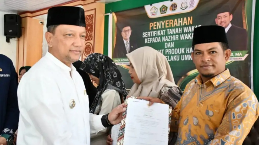 Pj. Bupati Aceh Tengah T Mirzuan Serahkan Sertifikat Tanah Wakaf Dan Sertifikat Produk Halal
