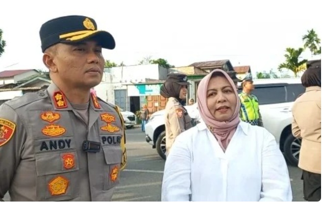Kapolres Langsa AKBP Andy Rahmansyah, S.IK, SH, MH, bersama Direktur PT CMN Ernawati saat bagi takjil, Selasa (02/04/2024) depan Polres Langsa.