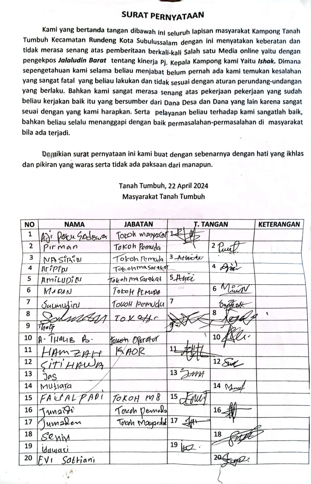 Untuk mengklarifikasi berita tersebut,salah satu tokoh masyarakat tanah tumbuh mengatakan, puasnya kinerja kepala Desa pj.ishak.