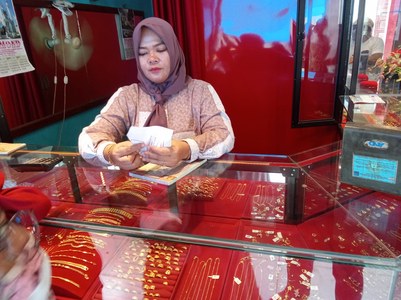 Armen, pedagang emas di kios pasar minggu Rimo ketika ditanyai, “iya memang saat ini harga emas sudah turun 10 ribu per gram, artinya dalam satu emas menurun 25.000 rupiah per emas”.