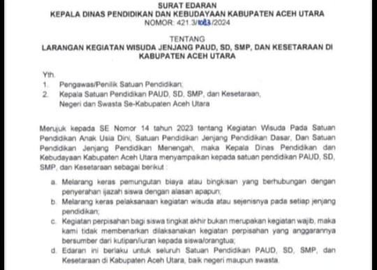 A1news.co.id|Aceh Utara– Disdikbud Aceh Utara melarang pihak sekolah di kabupaten Aceh Utara mengutip biaya penyerahan ijazah dan perpisahan atau wisuda dari Orang tua murid.