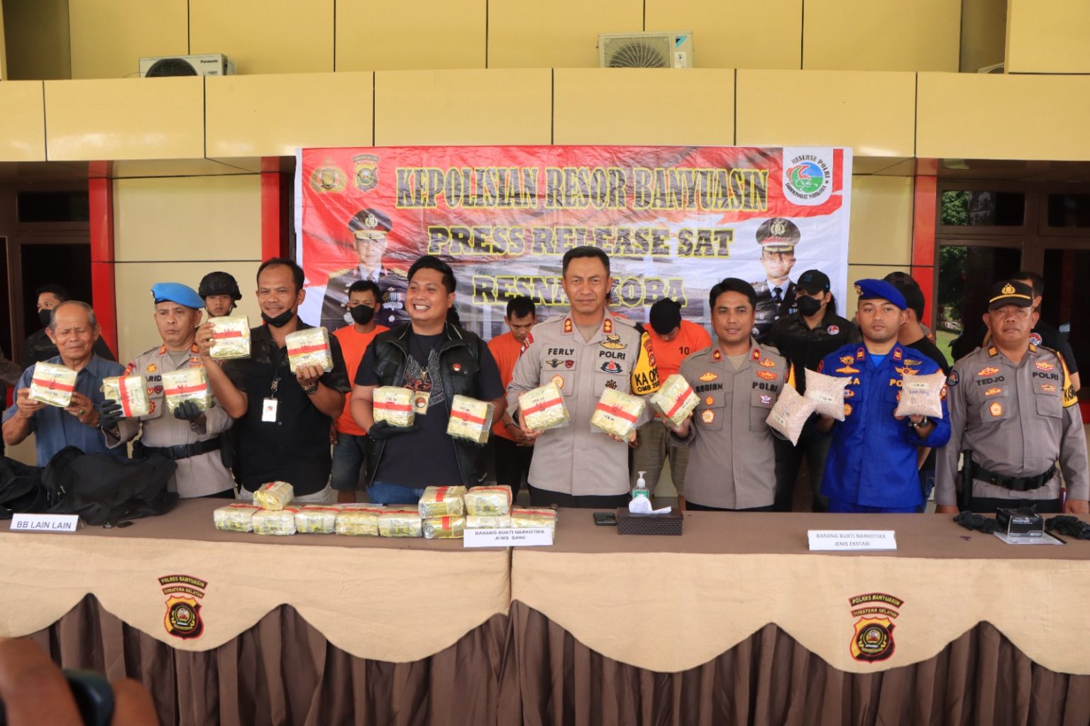 A1news.co.id|Palembang– Kasus narkoba 23 kilo gram sudah tahap 2 dengan 5 orang tersangka. Hal ini disampaikan Kapolres Banyuasin AKBP Ferly Rosa Putra SIK melalui Kasat Narkoba Polres Banyuasin yang disampaikan Kasi Humas Polres Banyuasin AKP Sutedjo.