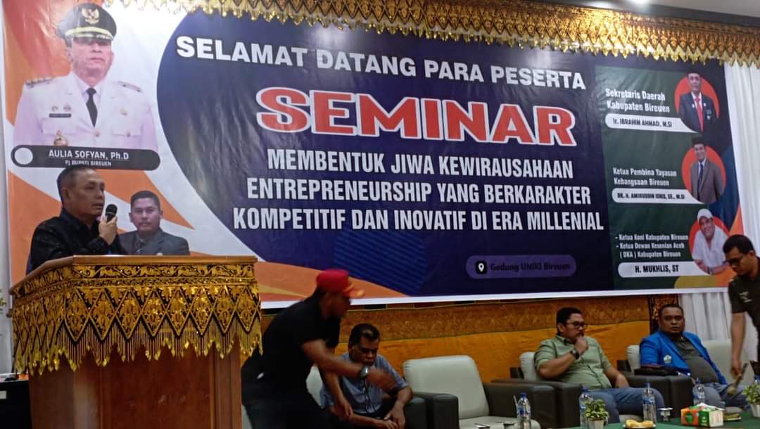 A1news.co.id|Bireuen– Sekretaris Daerah (Sekda) Kabupaten Bireuen, Ir Ibrahim Ahmad, MSi, turut menjadi salah seorang nara sumber seminar membentuk jiwa kewirausahaan enterpreneurship yang berkarakter kompetitif dan inovatif di era millenial yang berlangsung, Sabtu (18/5/2024) pagi, di Aula UNIKI Bireuen.