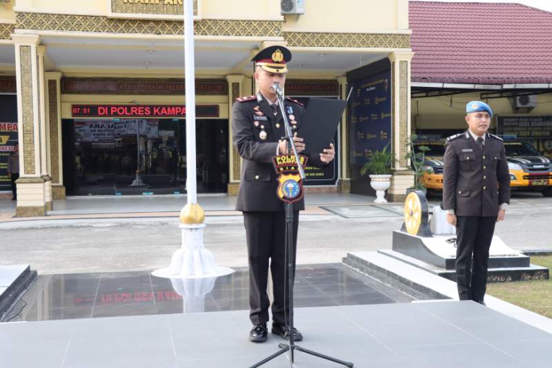 Kapolres Kampar AKBP Ronald Sumaja yang di wakili oleh Waka Polres Kampar Kompol Andi Cakra Putra menjadi Inspentuk Upacara kegiatan ini juga dihadiri oleh Pejabat Utama Polres Kampar, Kapolsek Jajaran dengan pserta personil Polres Kampar.