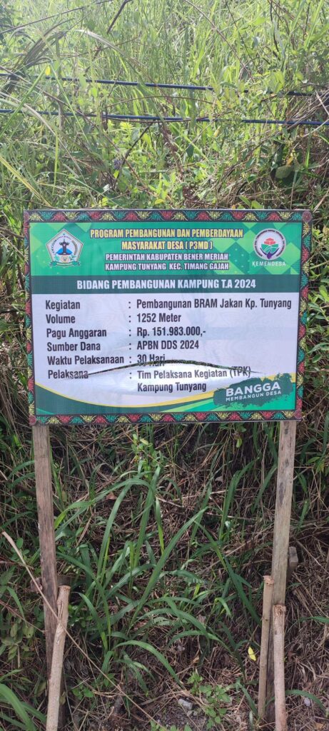 Disisi lain, awak media melihat papan informasi, Kegiatan : Pembangunan BRAM Jakan Kampung Tunyang, Volume : 1252 Meter, Pagu Anggaran : 151.983.000, Sumber Anggaran : APBN DDS 2024, Waktu Pelaksaan : 30 Hari, Pelaksana Kegiatan : Tim Pelaksana Kegiatan Kampung Tunyang.