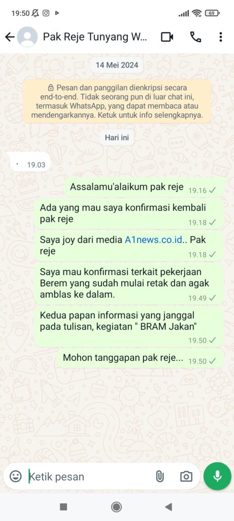 Pihak mediapun mencoba mengkonfirmasi ulang Reje kampung Tunyang melalui telpon seluler tidak di angkat dan Melalui Pesan Whatsapp terkait berem yang retak retak dan yang amblas dan Papan Informasi yang ada kejanggalan, Tidak di balas dan sampai berita ini di tayangkan.(DA)