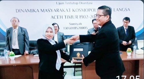 Judul disertasi Sumiyati yang dianglkat dan berhasil dipertahankannya itu berjudul : Dinamika Masyarakat Kosmopolitan Di Langsa Aceh Timur Tahun 1902-2012.