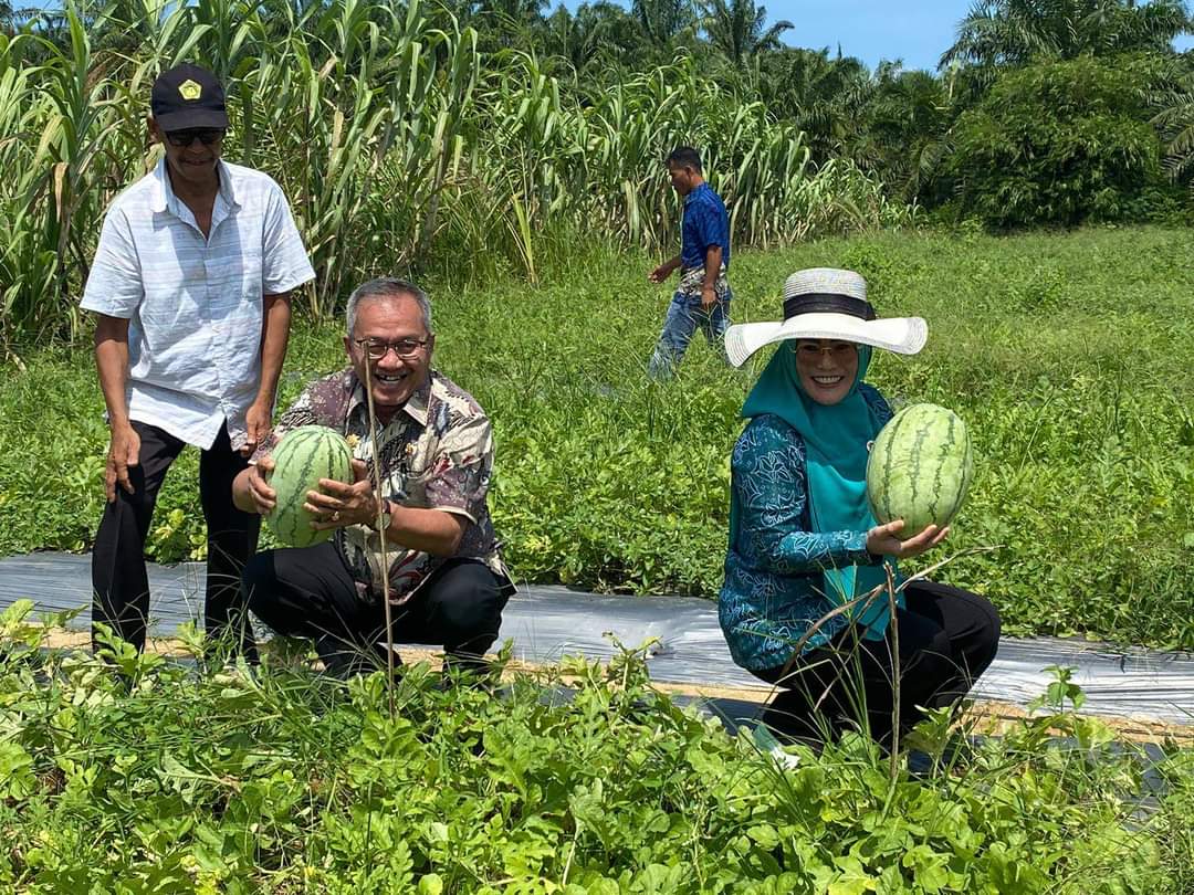 A1news.co.id|Aceh Singkil – Pj Bupati Drs. Azmi, M. AP dan Pj Ketua TP-PKK Ny. Emma Malini Azmi terlihat bersemangat menyantap buah semangka yang baru saja di panen oleh petani di desa Tanah Bara Kecamatan Gunung Meriah.