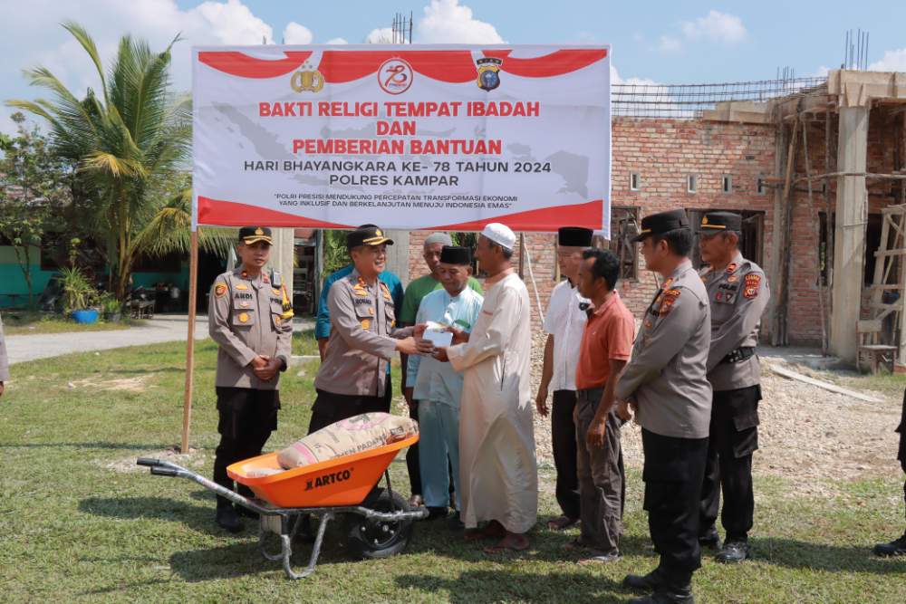 A1news.co.id|Kampar– Menjelang peringatan Hari Bhayangkara ke-78 tahun 2024, Jajaran Polres Kampar menggelar kegiatan Bakti Religi Tempat Ibadah dan Pemberian Bantuan Baterial Pembangun Madrasah Ibtidaiyah Nurul Iman Desa Kampar pada hari Jumat (14/6/2024) sekira pukul 13.30 wib.