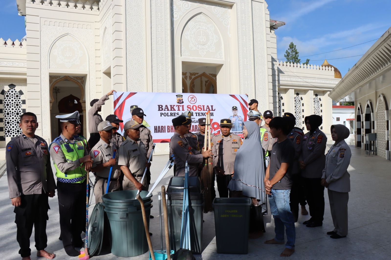 A1news.co.id|Takengon– Dalam rangka menyambut Hari Bhayangkara ke-78 Tahun, Personel Polres Aceh Tengah melaksanakan bakti sosial dengan bergotong royong di masjid, disertai pemberian sarana dan alat kebersihan diantaranya berupa, Ember, Tong Sampah dan Sapu kepada pengurus Masjid setempat.