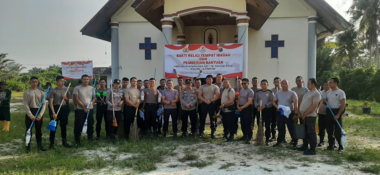 A1news.co.id|Kampar– Masih dalam rangka Rangkaian Hari Bhayangkara ke-78, Jajaran Polres Kampar menggelar kegiatan Bakti Sosial Religi dengan melakukan Goro di Gereja Santo Yosep Dusun Terang Bulan Desa Salo pada Sabtu pagi (15/6/2024).
