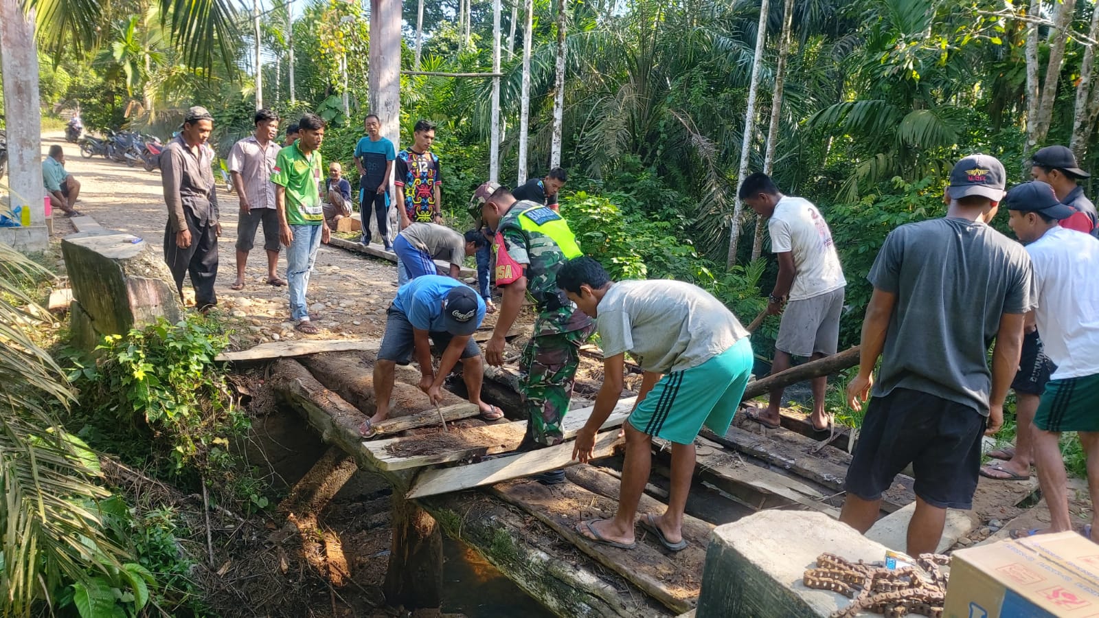 Aceh Timur – Babinsa Koramil 10/Spj, Kodim 0104/Atim, Serda Supardi bersama dengan warga gotong royong memperbaiki jembatan yang rusak di wilayah Desa Batu Sumbang, Kecamatan Simpang Jernih, Kabupaten Aceh Timur, Sabtu (15-Juni-2024).