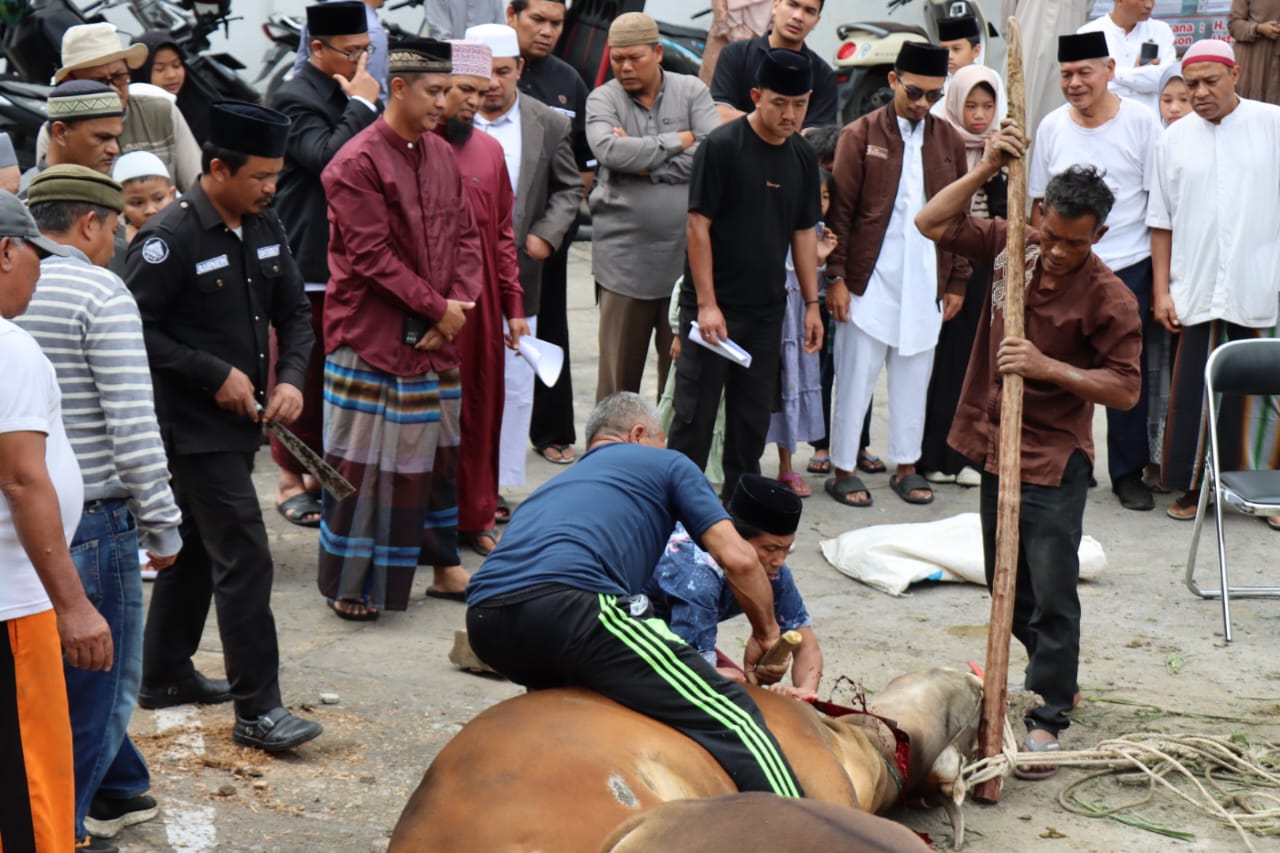 Kapolres Aceh Tengah AKBP Dody Indra Eka Putra, hadir langsung menyaksikan penyembelihan hewan qurban di halaman Masjid Ruhama yang dijadikan lokasi pemotongan hewan kurban ini.