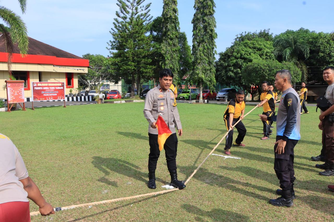 Kompol Adriansyah SE SIK selaku Wakapolres Banyuasin membuka pertandingan tarik tambang tersebut dan dalam Pertandingan tersebut setiap tim terdiri dari 6 peserta.