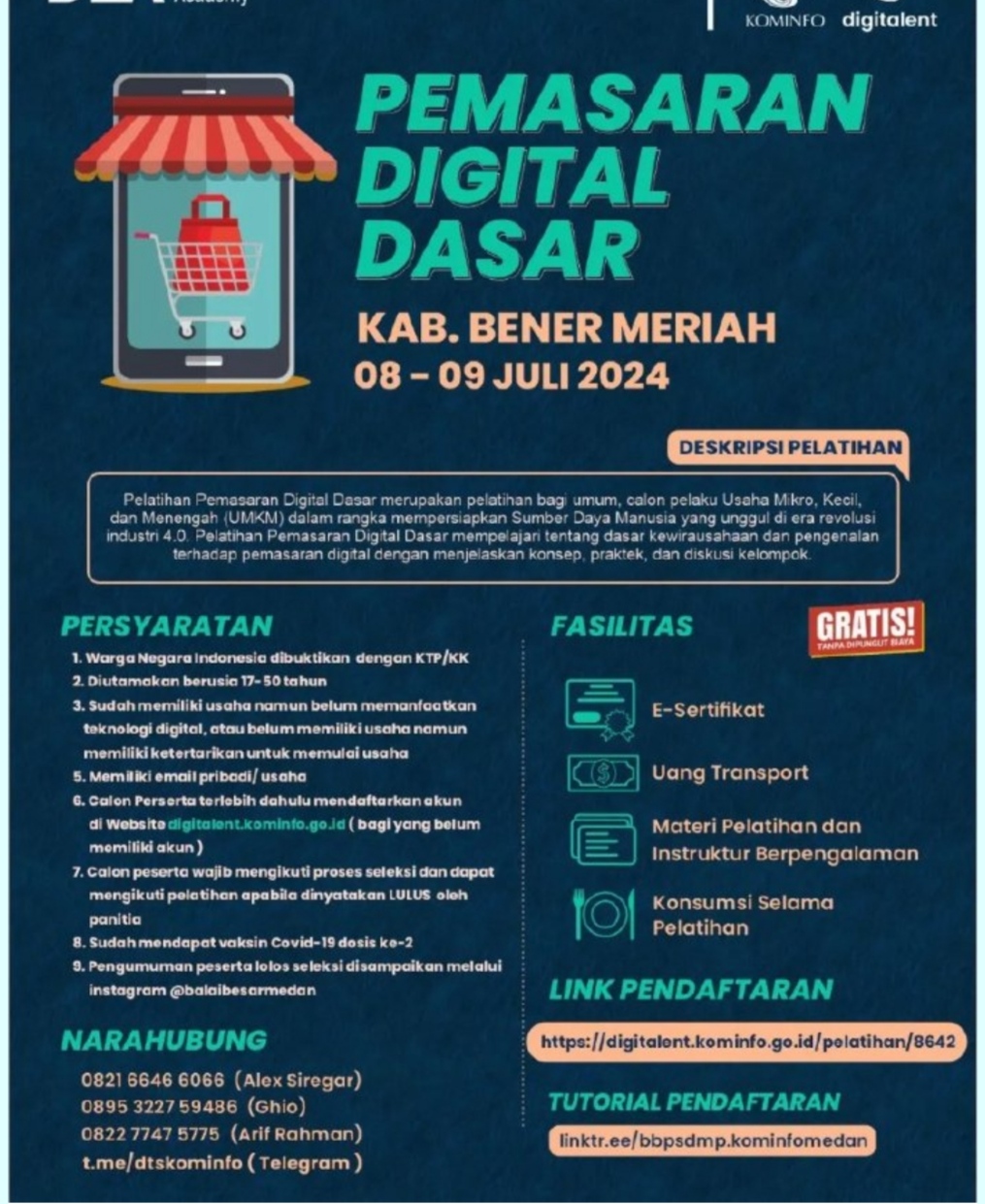 Untuk mendapatkan informasi lebih lanjut calon peserta dapat menghubungi nomor 0821 6646 6066 (Alex Siregar), 0895 3227 59486 (Gio), 0822 7747 5775 (Arif Rahman) dan di telengram t.me/dtskominfo. (DA).