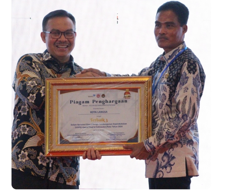 A1news.co.id|Langsa– Pemerintah kota Langsa meraih penghargaan Grand Design Pembangunan Kependudukan (GDPK) Award tahun 2024 peringkat III di tingkat nasional dari Badan Kependudukan dan Keluarga Berencana Nasional Republik Indonesia (BKKBN) RI.