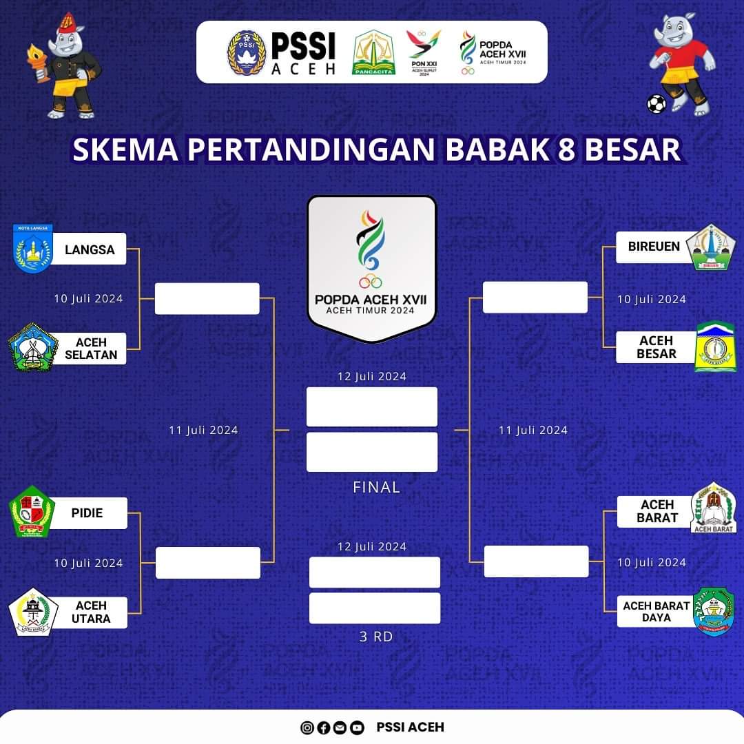 Jadwal pertandingan 8 besar dimilai 10 Juni 2024 rincian Langsa vs Aceh Selatan (Stadion Mon IX), Besar vs Bireun (stadion Bukit Hitam Kecamatan Darul Ihsan)