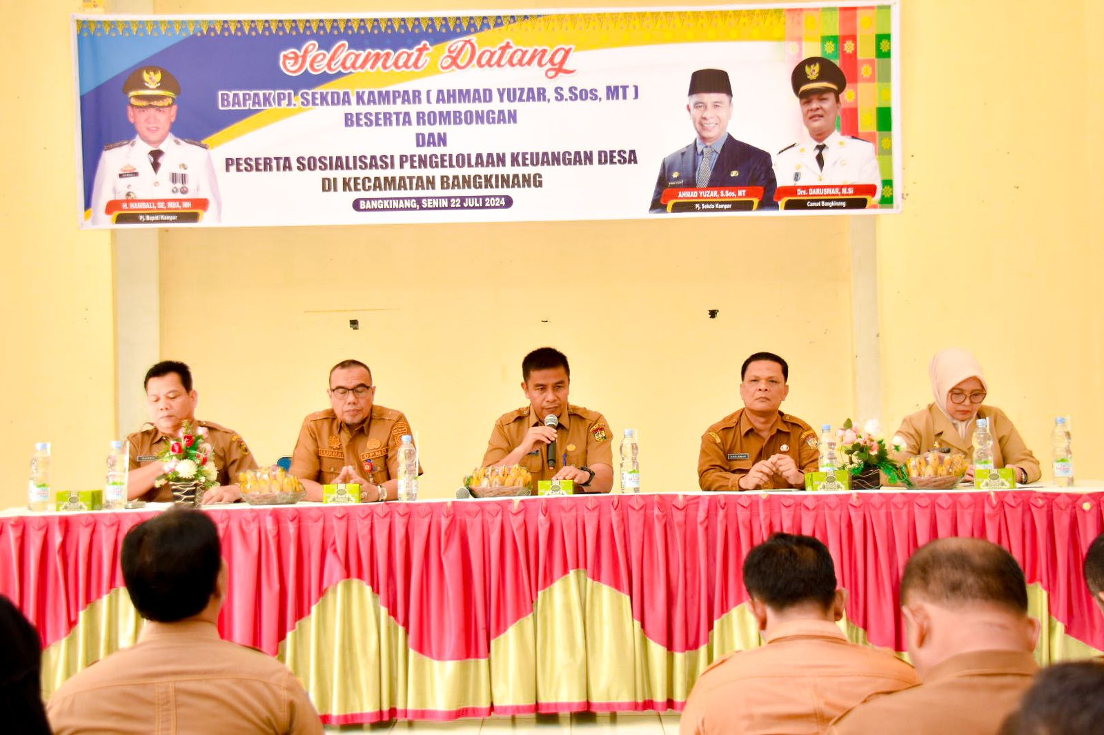 A1news.co.id|Kampar– Penjabat Bupati Kampar, Hambali SE MBA MH yang diwakili Pj Setda Kampar Ahmad Yuzar S,Sos MT didampingi Kadis Pemberdayaan Masyarakat Desa Lukmansyah Badoe S,Sos M, Camat Bangkinang Drs Darusman M,Si dan camat Bangkinang Kota Minda SH membuka secara resmi sosialisasi penyelenggaraan pemerintahan desa dan pengelolaan manajemen pemerintahan serta keuangan desa untuk seluruh desa di Kecamatan Bangkinang dan Bangkinang Kota. Jumat (22/7/2024)