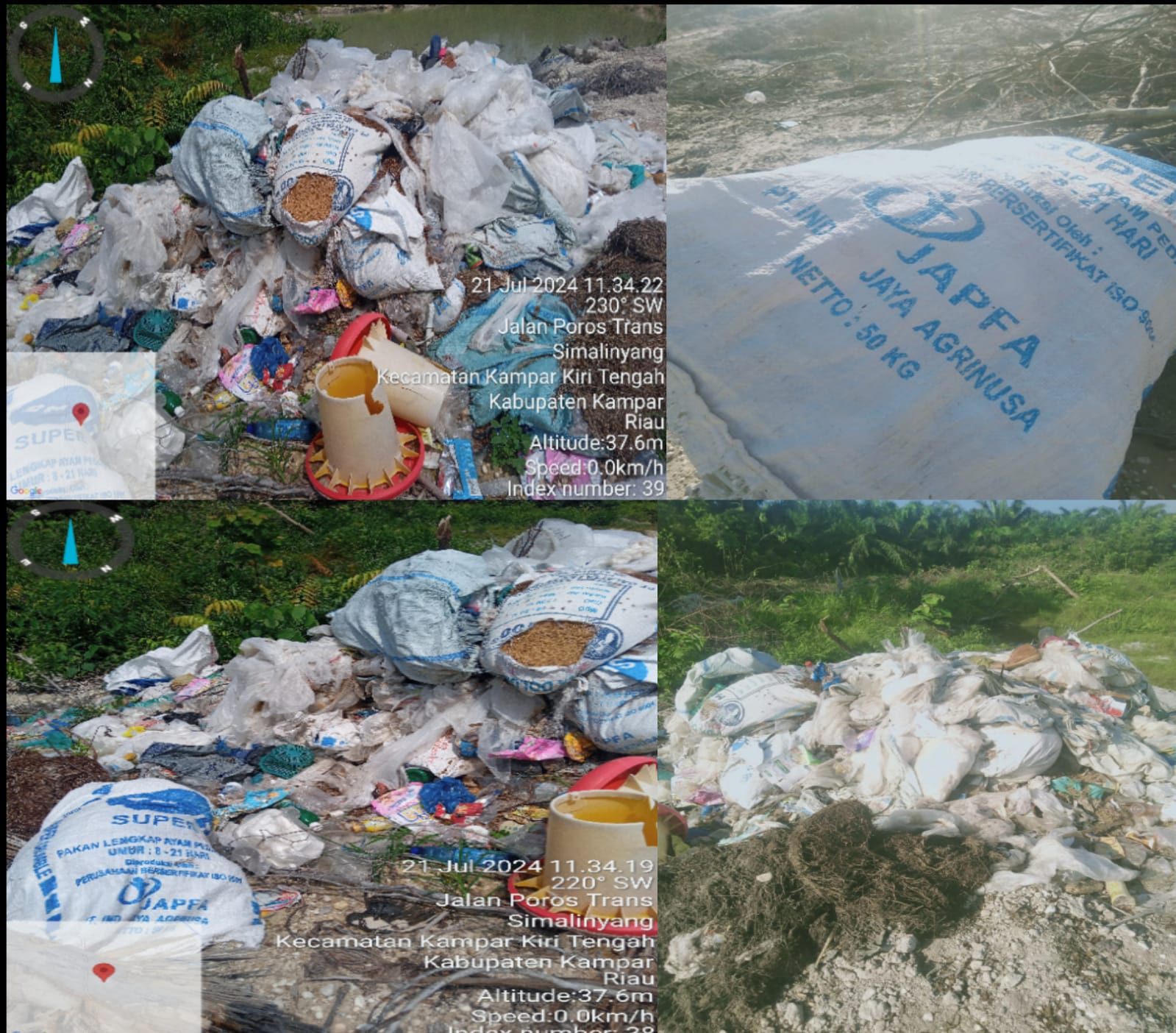 Yang paling anehnya sampah sampah itu berupa karung yang berisi serbuk taik ayam dan peralatan cangkir piring, untuk minum ayam maupun selang kecil tempat air minum , karung goni nya bermerk PT. Japfa .