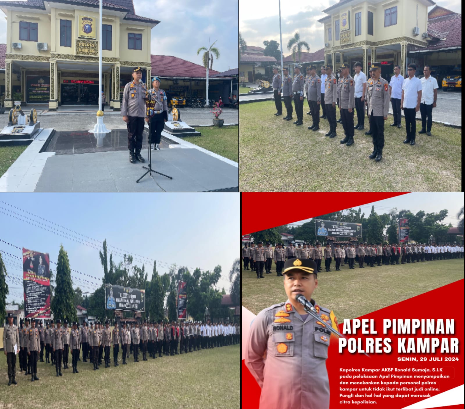 Kapolres Kampar tegaskan untuk anggota Polres Kampar dan Jajaran agar tidak melakukan pungli (Pungutan Liar) berupa apa pun, tidak ada anggota yang bermain judi online dan menggunakan narkoba kemudian memerintahkan kepada anggota untuk menindak tegas para mapia ilegal logging, ilegal mining dan pengedar narkoba.