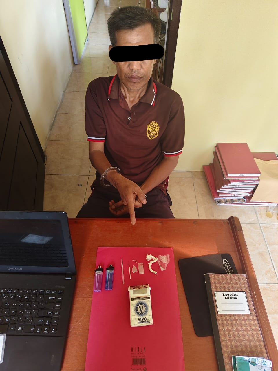 1 (satu) buah pipet yang digunakan untuk menyendok narkotika jenis sabu yang di dalamnya masih terdapat sisa butiran narkotika jenis sabu, 1 (satu) unit hp merk Xiaomi warna hitam, 2 (dua) buah mancis warna biru dan ungu, Tissue dan 1 (satu) buah kotak rokok merk Vivo,” jelas Kapolsek.