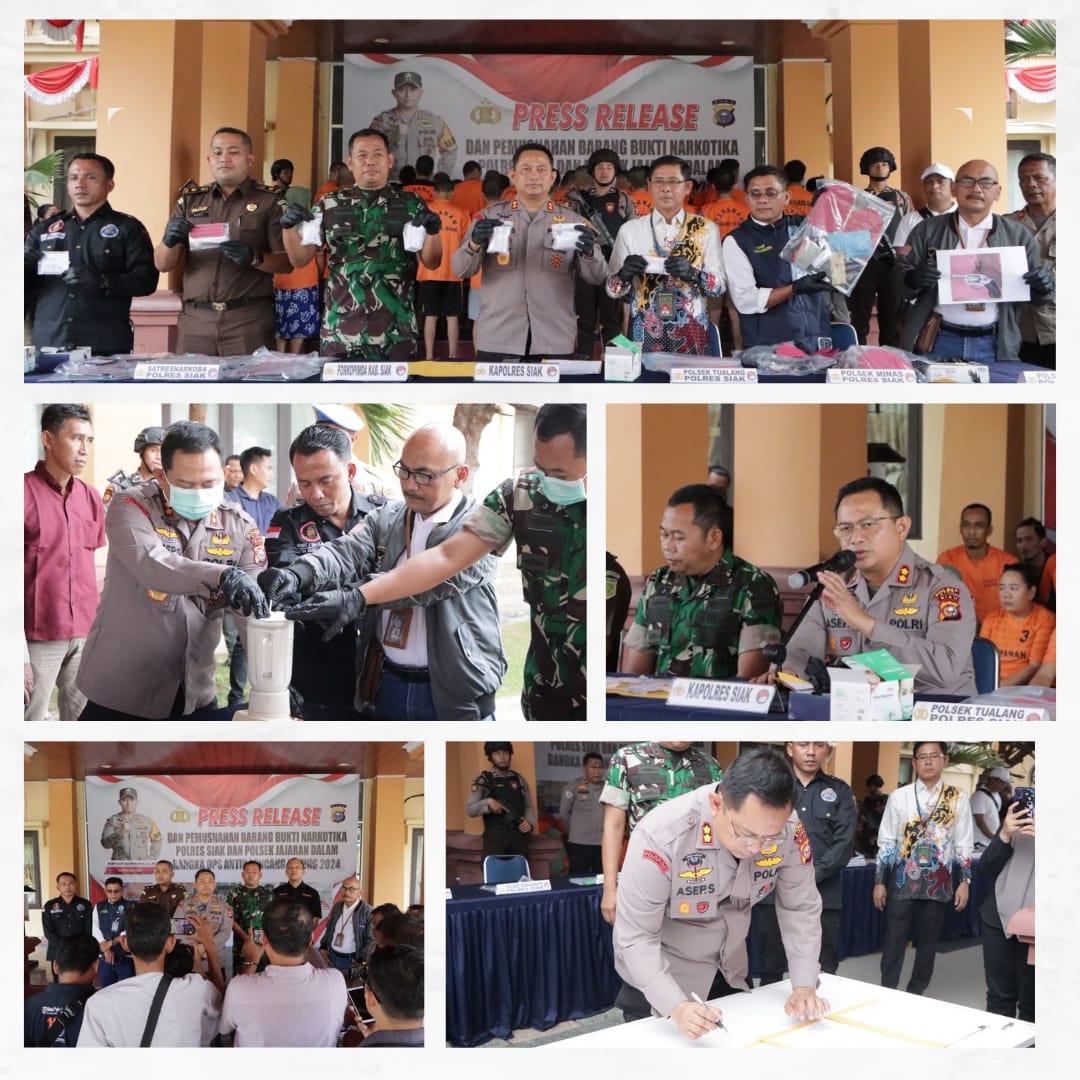Pihak Polres Siak selama periode 2024 berhasil mengungkap 109 perkara dan mengamankan 181 orang tersangka dengan barang bukti narkotika jenis sabu seberat 866,53 gram, daun ganja kering 55,2 gram dan Pil Ekstasi sebanyak 2 butir.