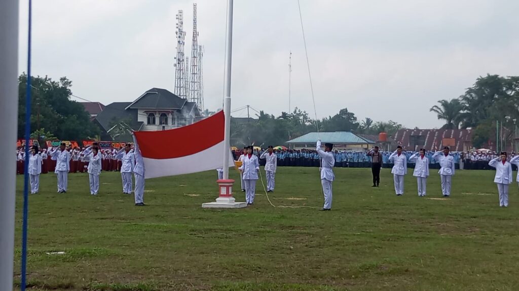 A1news.co.id|Kampar Kiri – Upacara pengibaran Bendera Merah Putih memperingati Hari Ulang Tahun (HUT) ke-79 Kemerdekaan Republik Indonesia (RI) di Lapangan bola depan kantor Lurah Lipat Kain Kecamatan Kampar kiri Kabupaten Kampar Sabtu (17/8/2024), pukul 07.00 Wib.