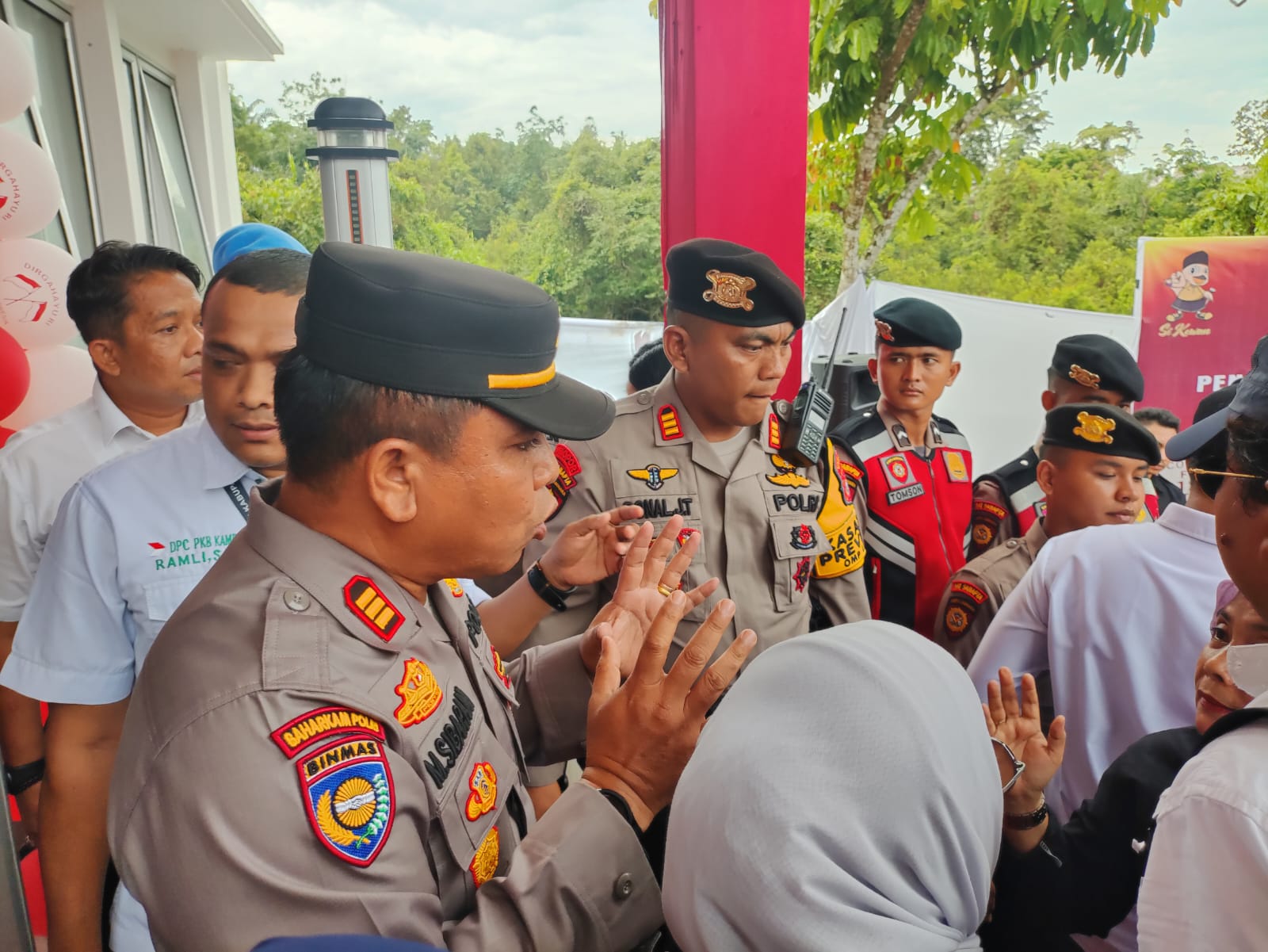 Tim pengamanan dari Binmas dan Samapta Polres Kampar melakukan pencegahan supaya tidak terjadi perdebatan antara massa pendukung dengan pihak KPU maupun antar sesama masyarakat simpatisan yang ingin ikut masuk dengan petugas pengamanan pintu masuk,