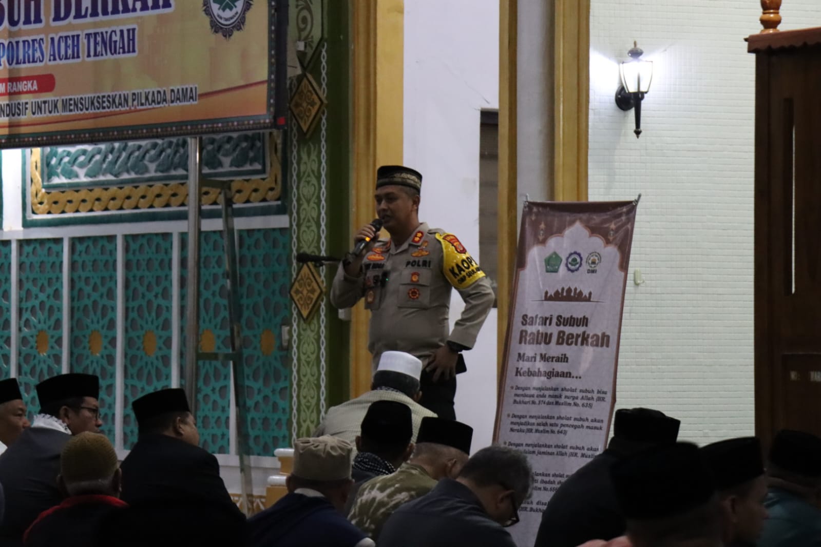 A1news.co.id|Takengon– Polres Aceh Tengah bekerjasama dengan IAIN Takengon menggelar safari subuh berkah dalam rangka menjaga menjaga stabilitas keamanan yang kondusif untuk mensukseskan pilkada damai 2024.