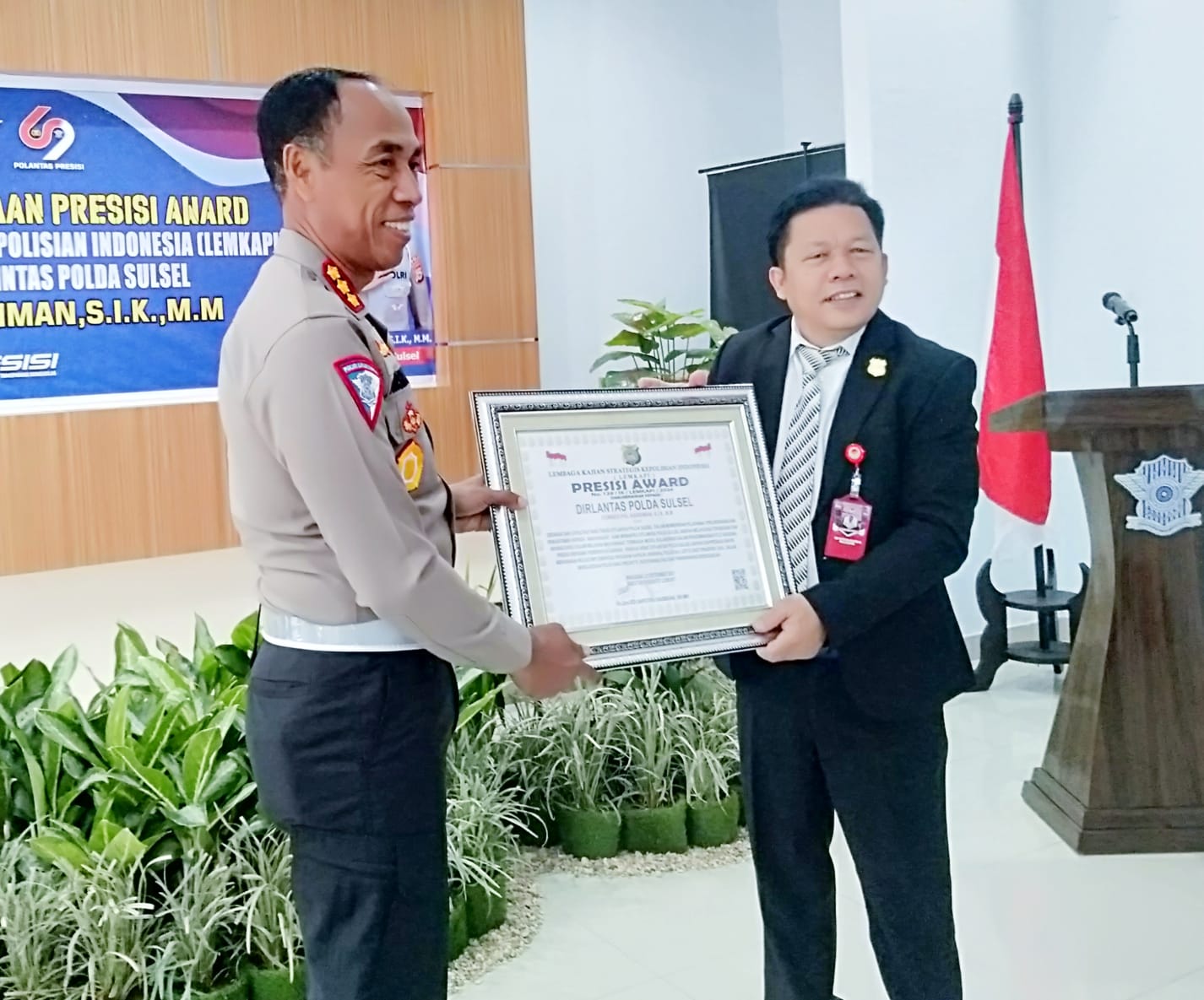 A1news.co.id|Makassar– Direktorat Lalu Lintas (Ditlantas) Polda Sulawesi Selatan (Sulsel) kembali mencetak prestasi dengan meraih Presisi Award dari Lembaga Kajian Strategis Kepolisian (LEMKAPI) yang diterima oleh Dirlantas Polda Sulsel, Kombes Pol. Karsiman, SIK MM, di Aula Biru Ditlantas, Jumat, (13/09/2024).