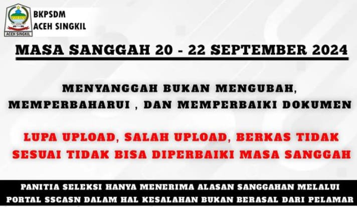 perkembangan seleksi melalui portal https://sscasn.bkn.go.id maupun website https://bkpsdm.acehsingkil.go.id serta media-media sosial BKPSDM Kabupaten Aceh Singkil. (Irfan)