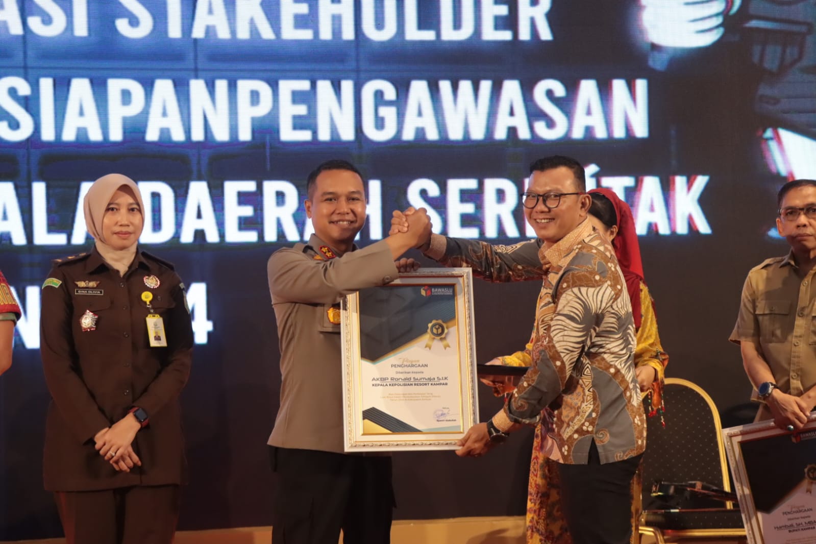A1news.co.id|Kampar– Kapolres Kampar AKBP Ronald Sumaja terima penghargaan dukungan dan partisipasi mensukseskan tahapan Pilkada Kabupaten Kampar 2024 oleh Bawaslu Kampar di Labersa Grand Hotel And Convention Center, Selasa (17/9/2024).