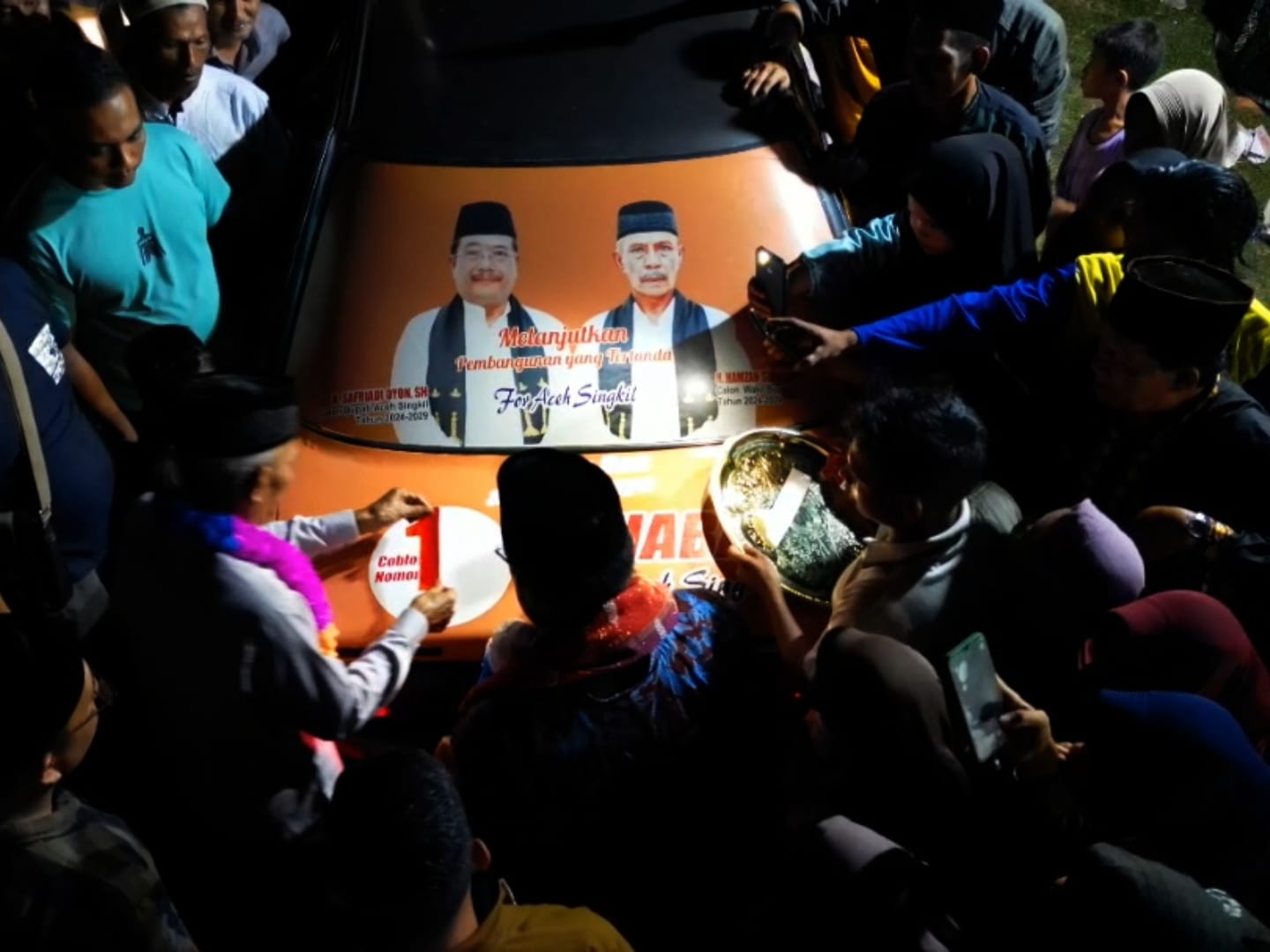 Namun, stiker di mobil tersebut belum dibuat nomor urut pasangan Calon Bupati Aceh Singkil yang memiliki nomor satu itu, dan saat berlangsungnya pertemuan silaturahmi yang dihadiri hampir 800 orang.