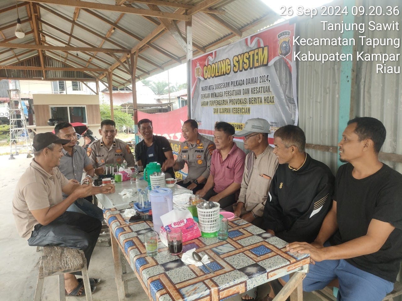 A1news.co.id|Kampar– Upaya menciptakan Pilkada Damai 2024 terus dilakukan Polsek Tapung, kali ini Waka Polsek Tapung melakukan cooling system Pilkada Damai di warung Kopi di Desa Tanjung Sawit, Kecamatan Tapung, Jum’at (27/9/2024)