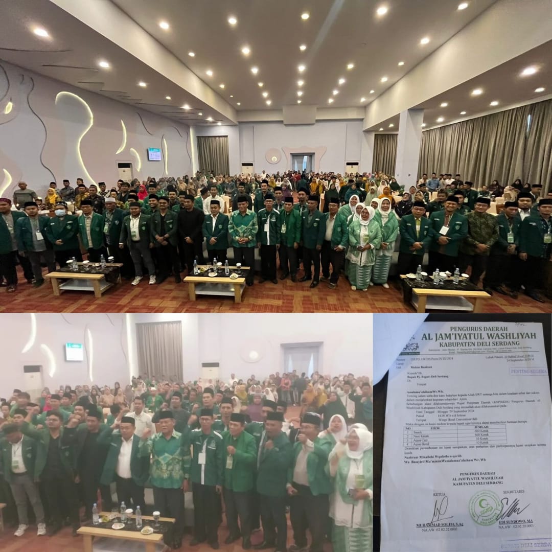 A1news.co.id|Deli Serdang-Sejumlah massa kader organisasi masyarakat (ormas) Al Jam’iyatul Washliyah Kabupaten Deli Serdang menggelar rapat pimpinan daerah (Rapimda) di aula Hotel Wing Kualanamu, Jalan Arteri Bandara Kualanamu, Desa Tumpatan Nibung, Kecamatan Batang Kuis, Kabupaten Deliserdang, Minggu (29/9/2024) sore.