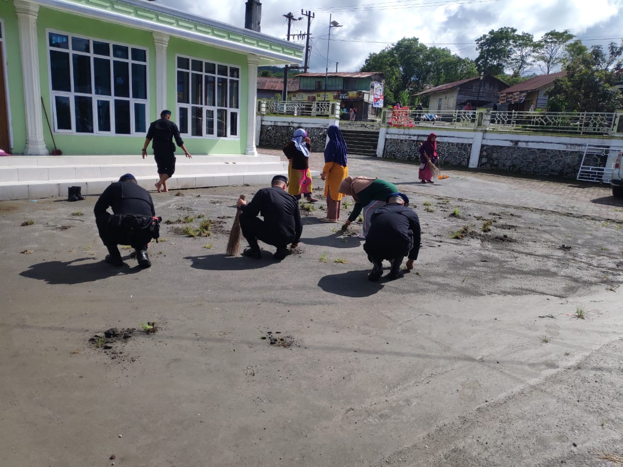 Personel Brimob dan masyarakat melaksanakan pembersihan di seputaran masjid seperti mencabuti rumput yang sudah panjang, mengecet dinding, membersikan kamar mandi dan tak lupa juga membersikan di dalam masjid.