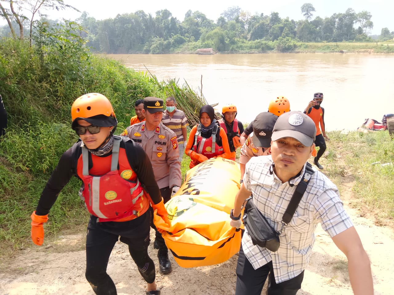 Selanjutnya korban dievakuasi oleh tim BASARNAS ke atas perahu karet untuk di bawa ke posko SAR dibawah jembatan Desa Rantau Kasih.