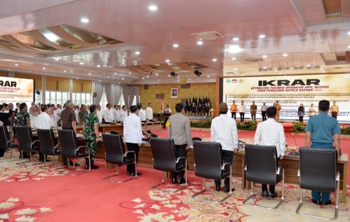FOTO: Pj. Gubernur Sumatera Utara (Sumut) Agus Fatoni beserta Forkopimda Sumut melakukan Deklarasi Netralitas ASN Se-Sumut sekaligus memimpin Rapat Koordinasi Pemilihan Kepala Daerah di Aula Tengku Rizal Nurdin Jalan Sudirman Kota Medan, Rabu (23/10). Deklarasi tersebut diikuti oleh ASN di lingkungan Pemerintah Provinsi dan Kabupaten/Kota se-Sumut.(RZ)