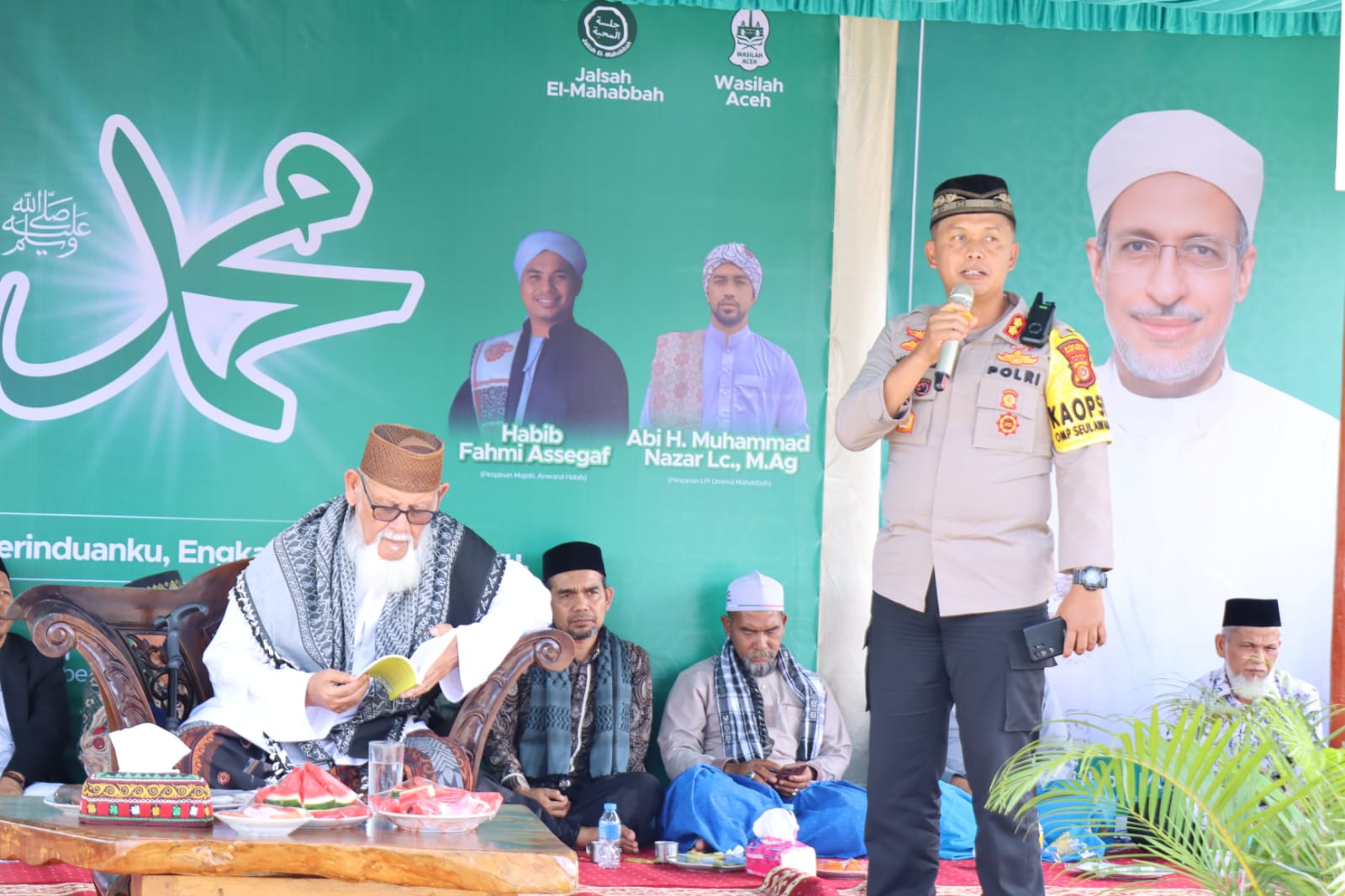 Dalam kesempatannya sebelum menyampaikan himbauan dan pesan kamtibmasbya, Kapolres Aceh Tengah mengajak warga dan jamaah bersama sama melantunkan Salawat Nabi.