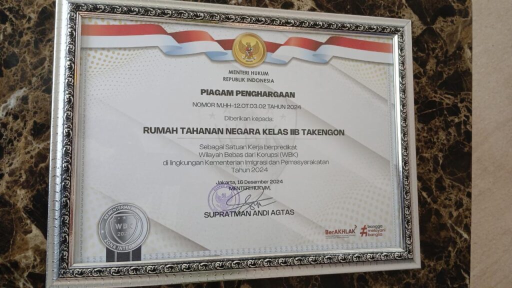 A1news.co.id|Jakarta – Setelah melalui rangkaian penilaian panjang dalam kontestasi Wilayah Bebas Korupsi (WBK) akhirnya Rumah Tahanan Negara (Rutan) Kelas IIB Takengon berhasil meraih predikat Wilayah Bebas Korupsi (WBK) tahun 2024.