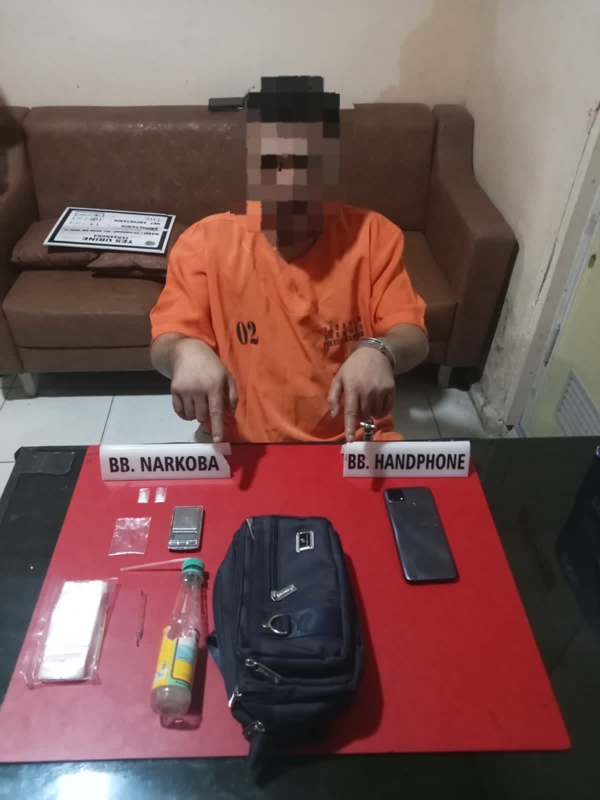 Dari tangan tersangka, polisi menyita barang bukti berupa 2 paket narkotika jenis shabu yang dibungkus dengan plastik bening dengan berat bruto 0,38 gram, 1 unit timbangan digital, 1 unit handphone merek realme warna abu-abu dengan sim card, 1 tas sandang warna biru dongker, 1 alat hisap (bong), 1 kaca pirex, 1 ball plastik klip, dan 1 plastik klip.