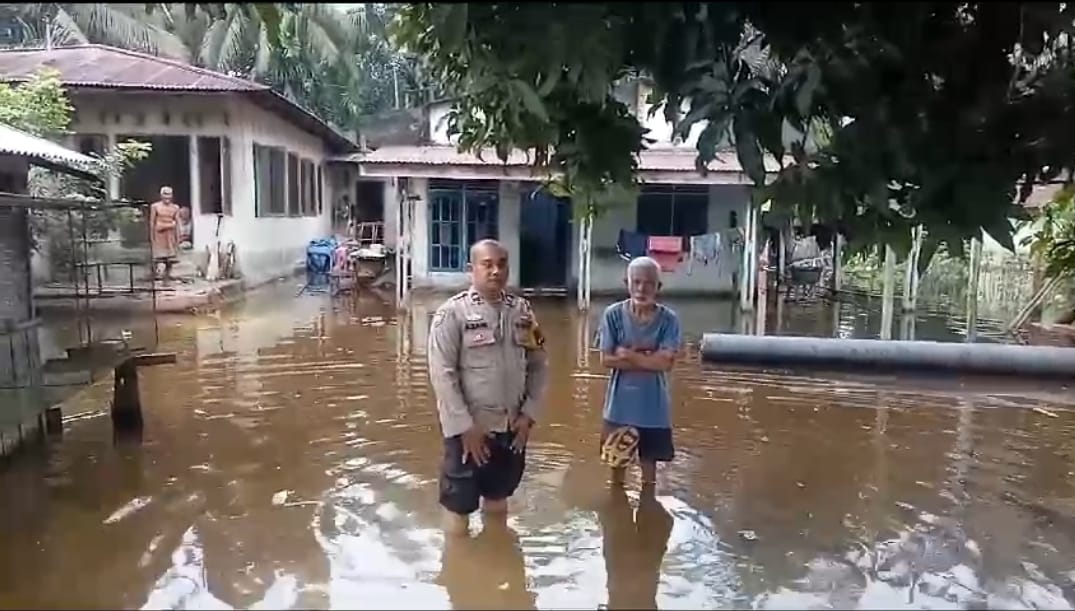 Aipda Azani melakukan pengecekan debit air Sungai Kampar dan menemukan genangan air yang sudah merendam sejumlah rumah warga, fasilitas umum, dan perkebunan di Dusun III dan Dusun IV Desa Teratak Buluh.