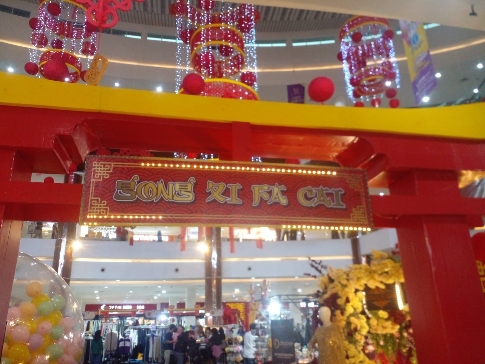 “Di pintu masuk mal bisa dilihat adanya ornamen Imlek yang cocok dijadikan spot foto oleh pengunjung.(Kurnia)