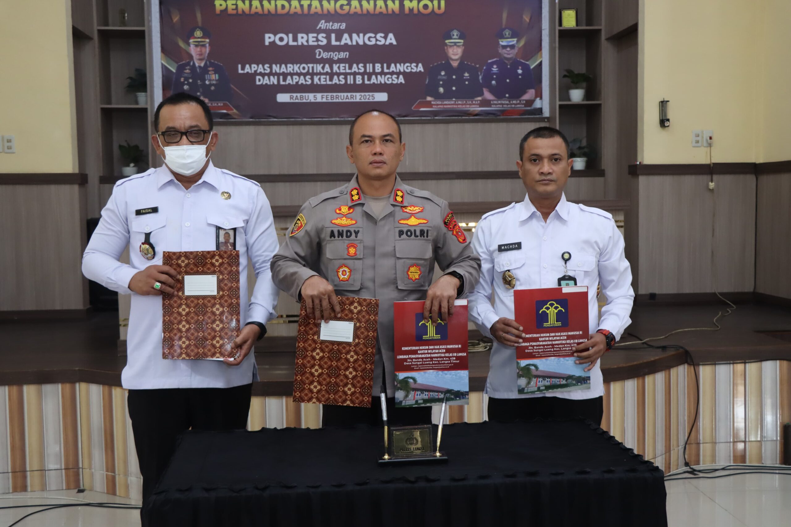 Penandatanganan MoU langsung oleh Kapolres Langsa AKBP Andy Rahmansyah, SIK, SH, MH, Kepala Lapas Kelas II B Langsa A. Halim Faisal, A.Md.I.P., S.H., serta Kepala Lapas Narkotika Kelas II B Langsa Machda Landasny, A.Md.I.P, SH, M.AP.