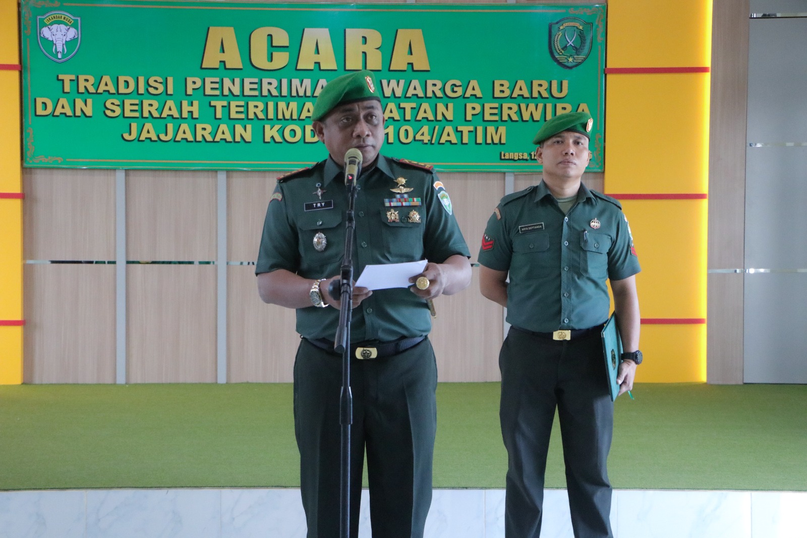 Dandim 0104 Aceh Timur, Letkol Inf Tri Purwanto, memimpin langsung Acara Tradisi Penerimaan Warga Baru dan Serah Terima Jabatan Perwira, sebuah prosesi yang menandai dinamika pembinaan satuan di lingkungan Kodim 0104/Atim.