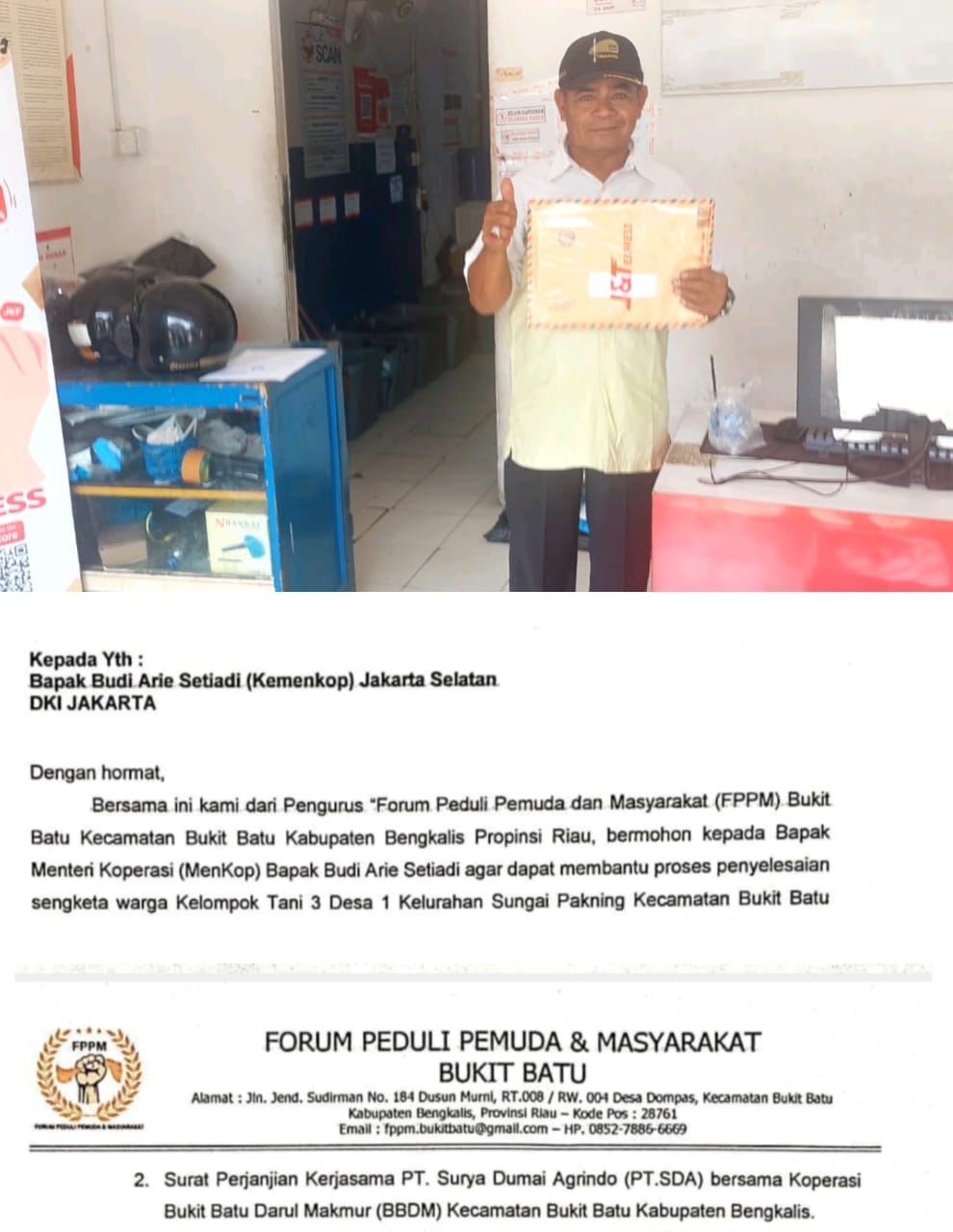 Dalam Suratnya, FPPMB agar Budi Ariel Setiadi agar dapat membantu proses penyelesaian sengketa warga Kelompok Tani 3 (Tiga) Desa 1 (Satu) Kelurahan Sungai Pakning kecamatan Bukit Batu, Bengkalis bersama Mitra Koperasi BBDM selaku Mitra dari PT.SDA (Surya Dumai Agrindo)