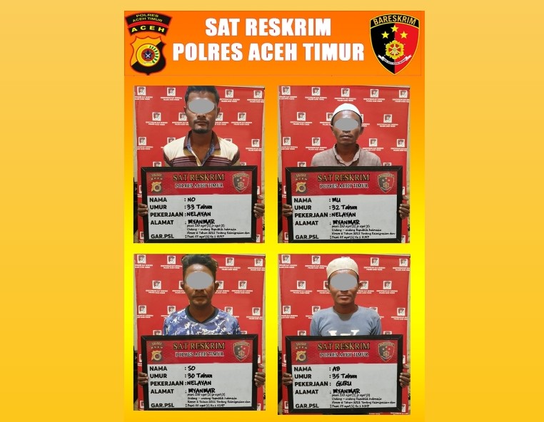 Aceh Timur – Penyidik dari Unit IV Perlindungan Perempuan dan Anak (PPA) Satreskrim Polres Aceh Timur, Polda Aceh kembali menetapkan 4 Warga Negara Asing (WNA) asal Myanmar sebagai tersangka baru pada tindak pidana penyelundupan manusia (TPPM) terhadap 264 imigran ilegal etnis Rohingya.