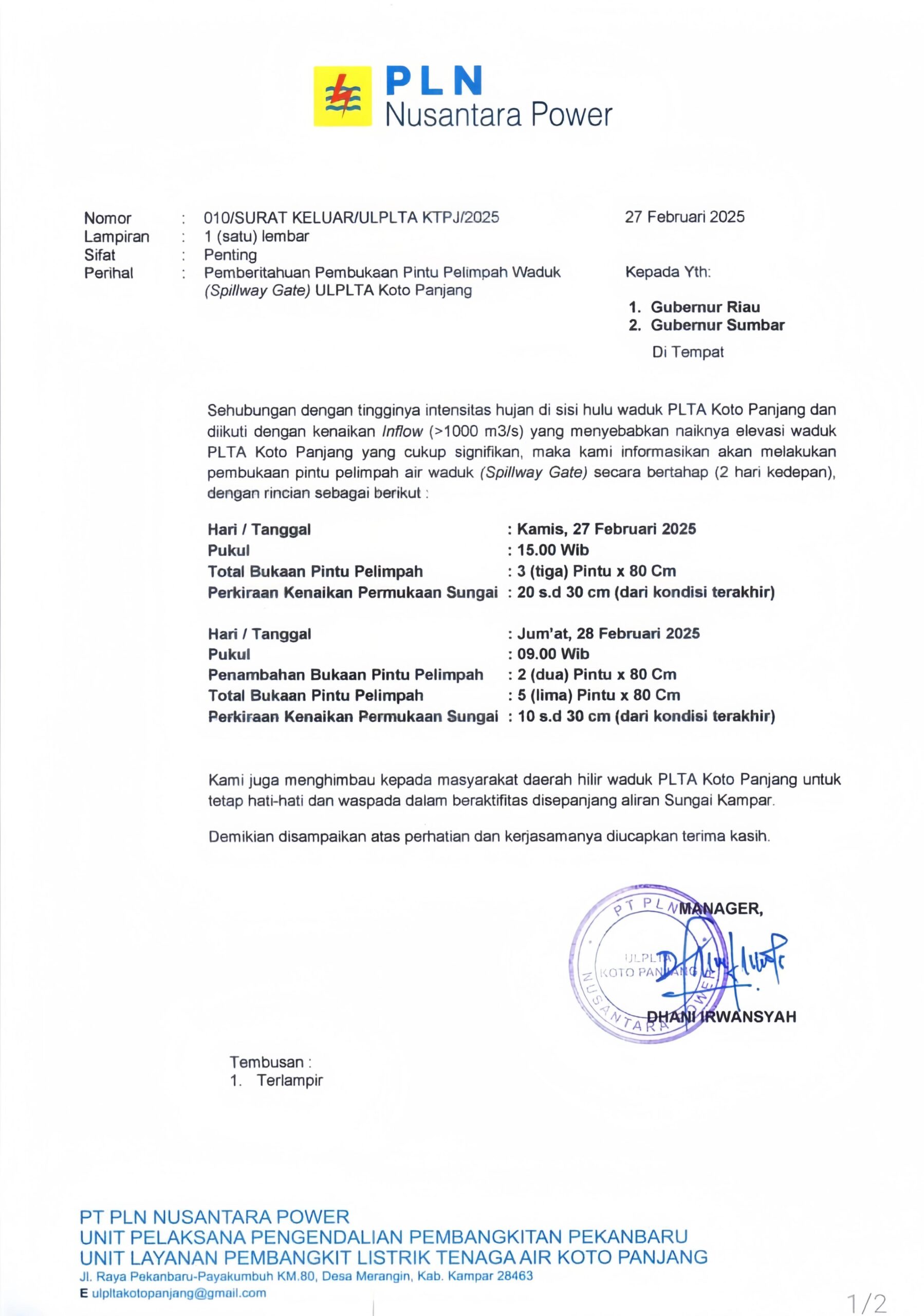 PLTA Koto Panjang akan melakukan pembukaan pintu pelimpahan air waduk (Spillway Gate) secara bertahap dalam dalam dua hari yakni hari ini Kamis tanggal 27 Februari 2025 dan pada hari Jum’at tanggal 28 Februari 2025.