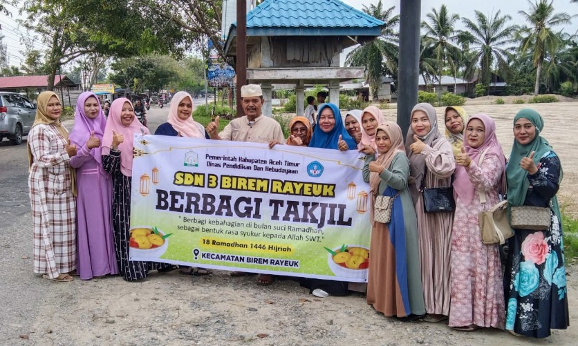 Aceh Timur – Sekolah Dasar Negeri 3 Birem Rayeuk, Kabupaten Aceh Timur, berbagi takjil untuk masyarakat, dalam bulan penuh berkah Ramadhan 1446 H/2025 M sebagai wujud menebar kebaikan, Selasa, 18 Maret 2025 petang.