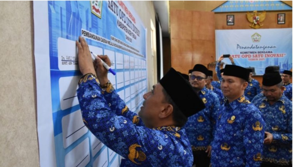 Sebagai bentuk komitmen, seluruh kepala Satuan Kerja Perangkat Kabupaten (SKPK) Aceh Tengah menandatangani komitmen “Satu OPD Satu Inovasi” dalam satu tahun, pada Senin (17/03/2025).